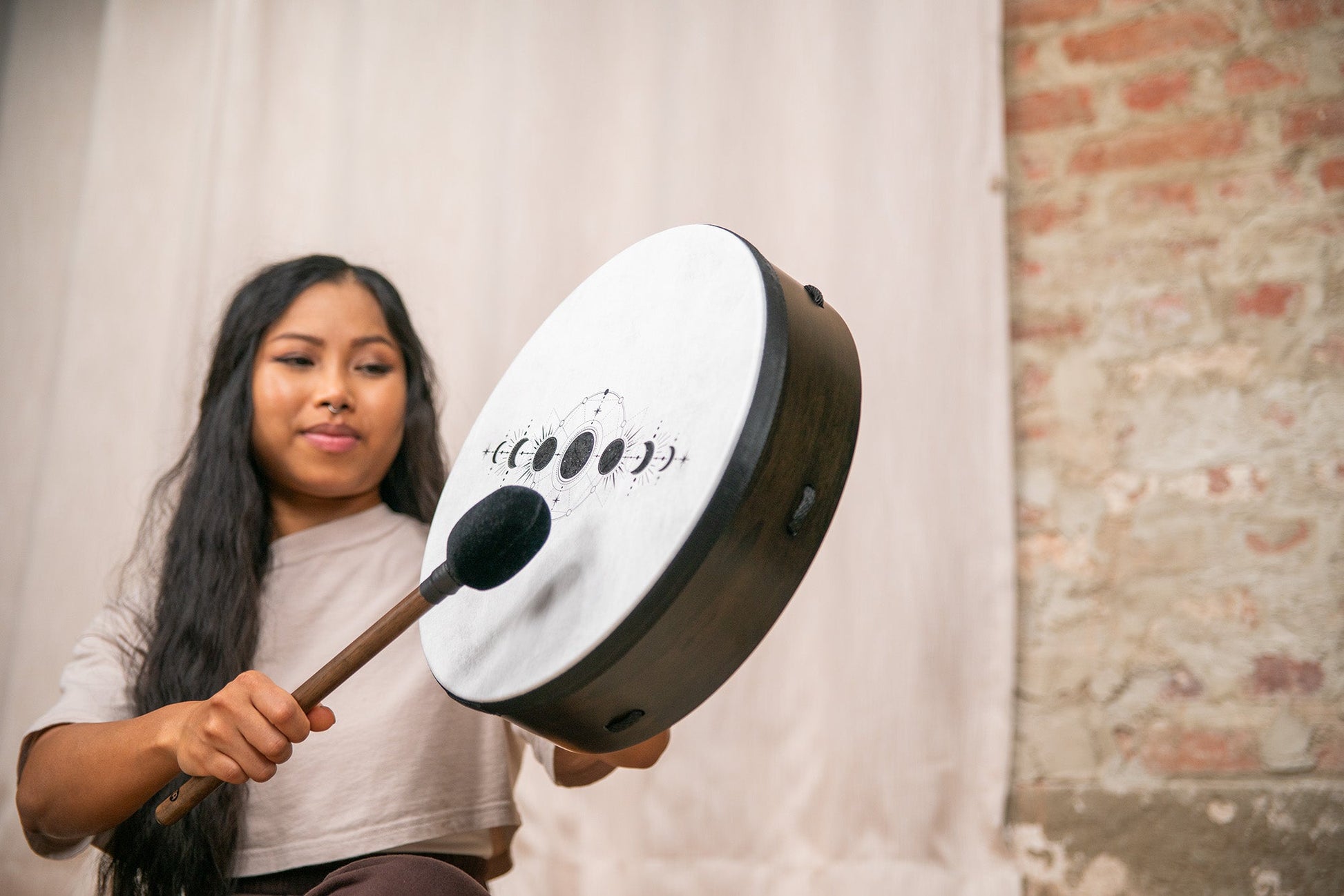 - Celestial Connection — Moon Phases symbol enhances ritual drumming, aligning with lunar cycles and spiritual awareness.