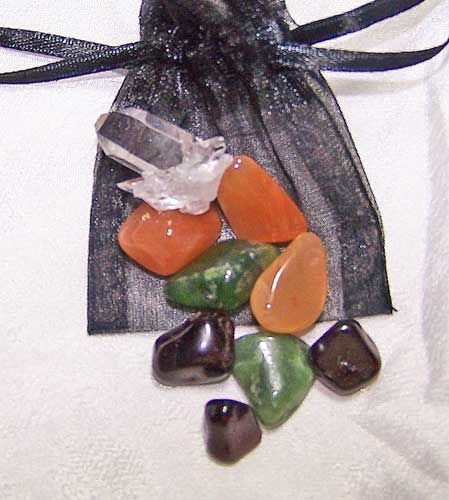 Medicine Pouches contain stones and - crystal that correspond with theme chosen. They make - great gift for someone that would like the properties and powers of the stones without wearing jewelry. Great for pocket or purse. Black Organdy pouch and information detail card included.
