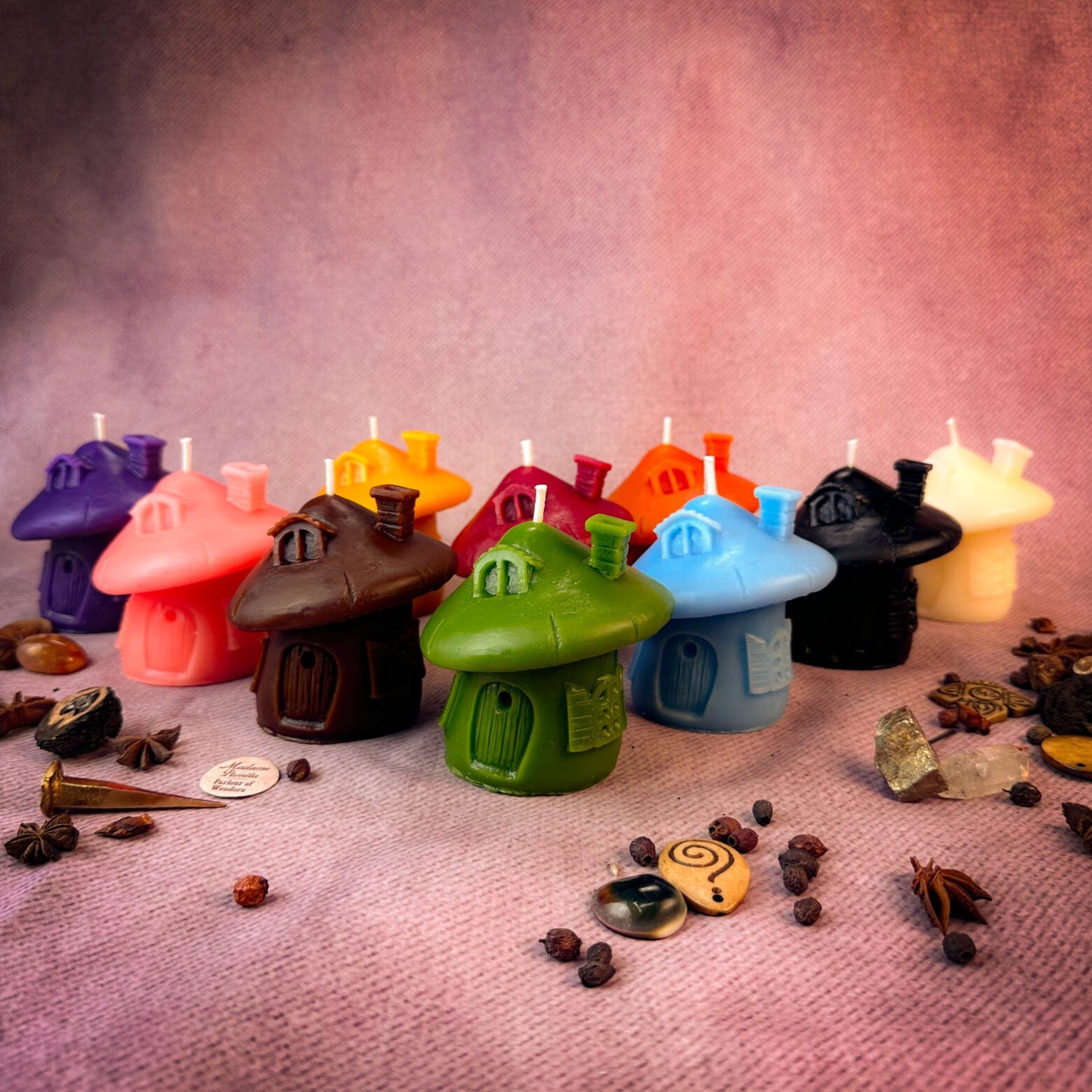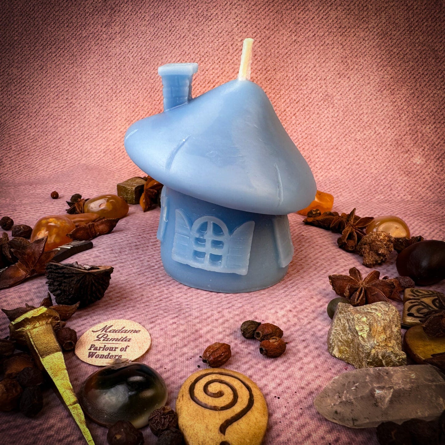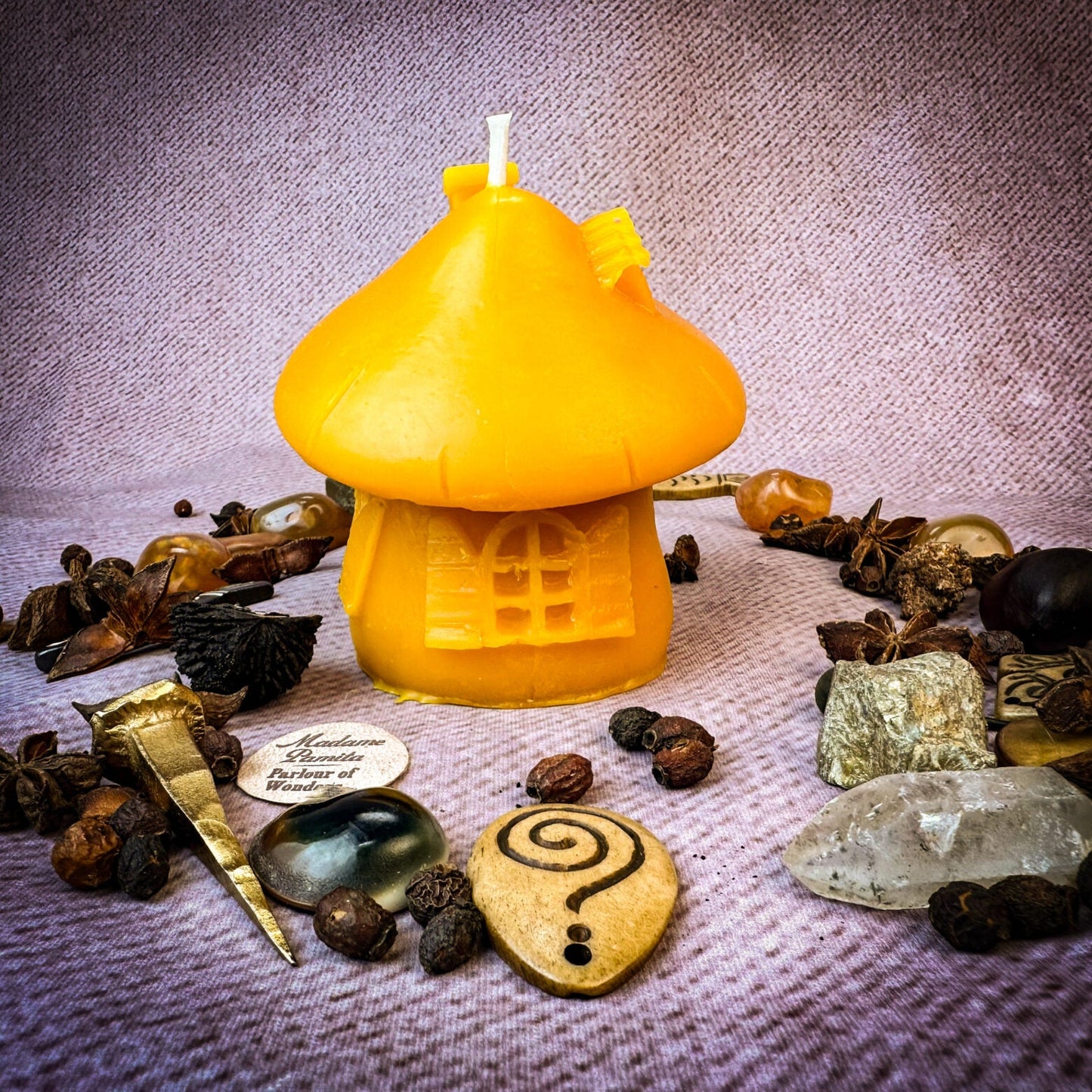 This Beeswax Mushroom Fairy Hut Spell Candle is a portal to the fairy realms. Burn it to access the magic of the fae folk, to ask for their guidance or protection, or as an offering to the little people.