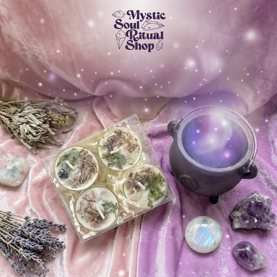 Honor the great Celtic goddess of transformation with this 4-pack of Cerridwen tea lights, each hand-poured and crafted to channel her sacred essence. Cerridwen—keeper of the cauldron, goddess of rebirth, and weaver of wisdom—guides you through cycles of change, inspiration, and deep inner knowing.