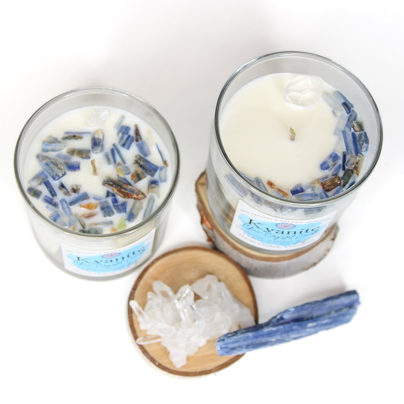 Ingredients: Soy Wax †, Coconut Wax ‡, Hemp Wick ‡, Bees Wax ‡, Natural Blue Kyanite Crystals, Arkansas Quartz Crystal