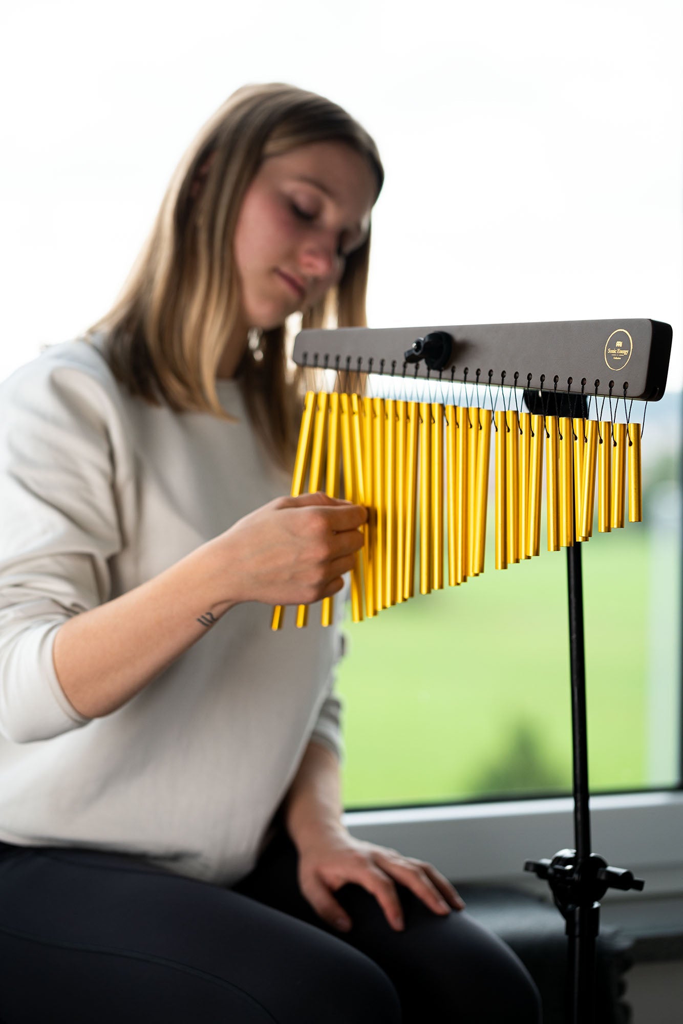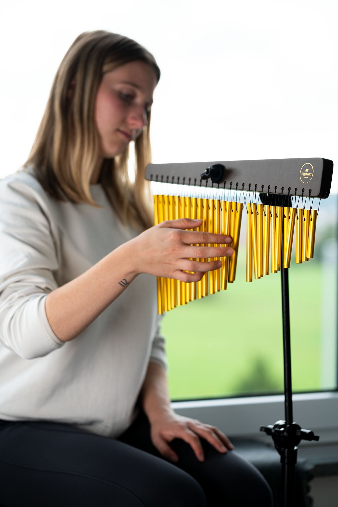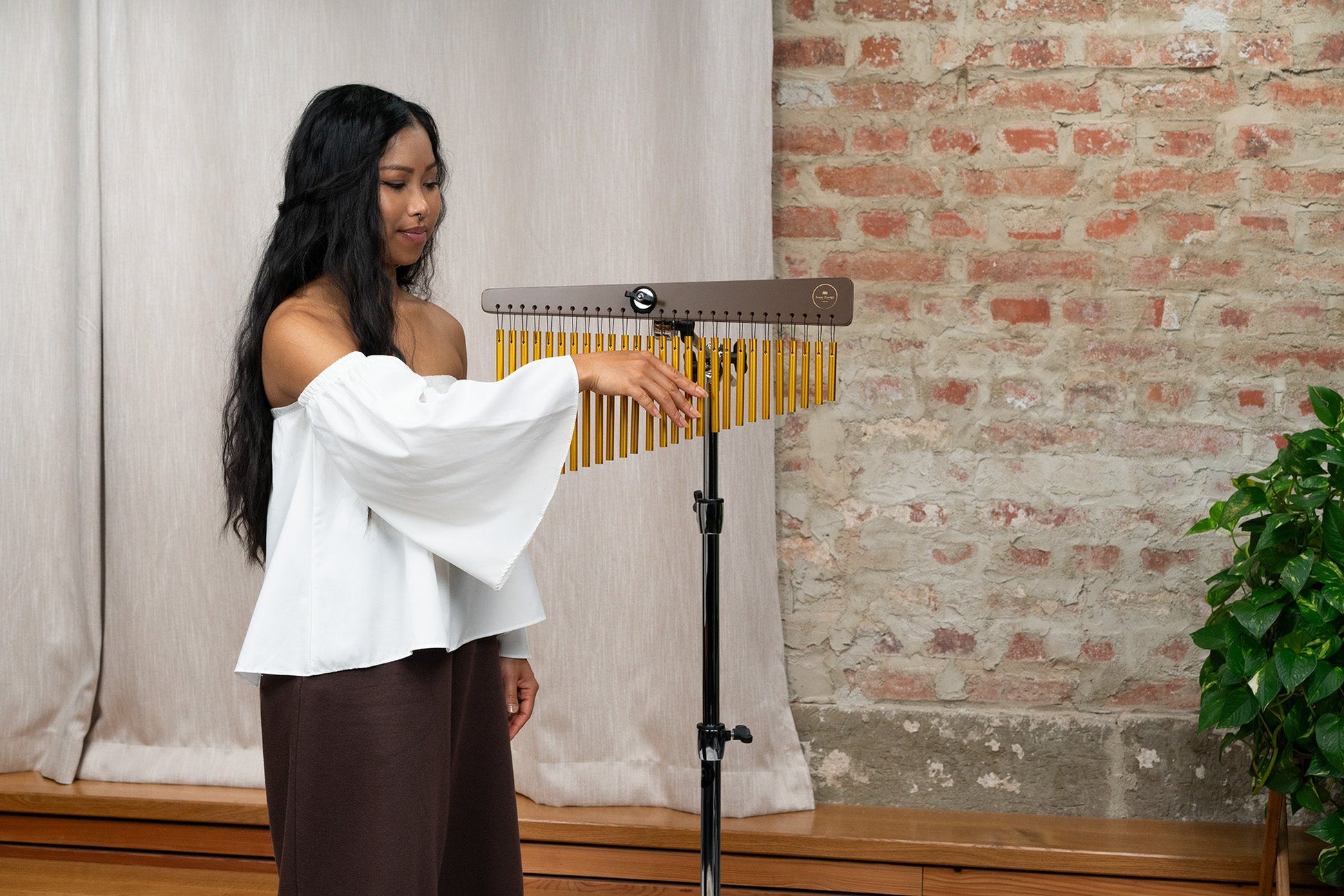 Invite celestial harmonies into your spiritual practice with these exquisite 27-bar chimes, featuring gold anodized aluminum bars against warm walnut brown Jamjuree wood for a full spectrum of healing frequencies.