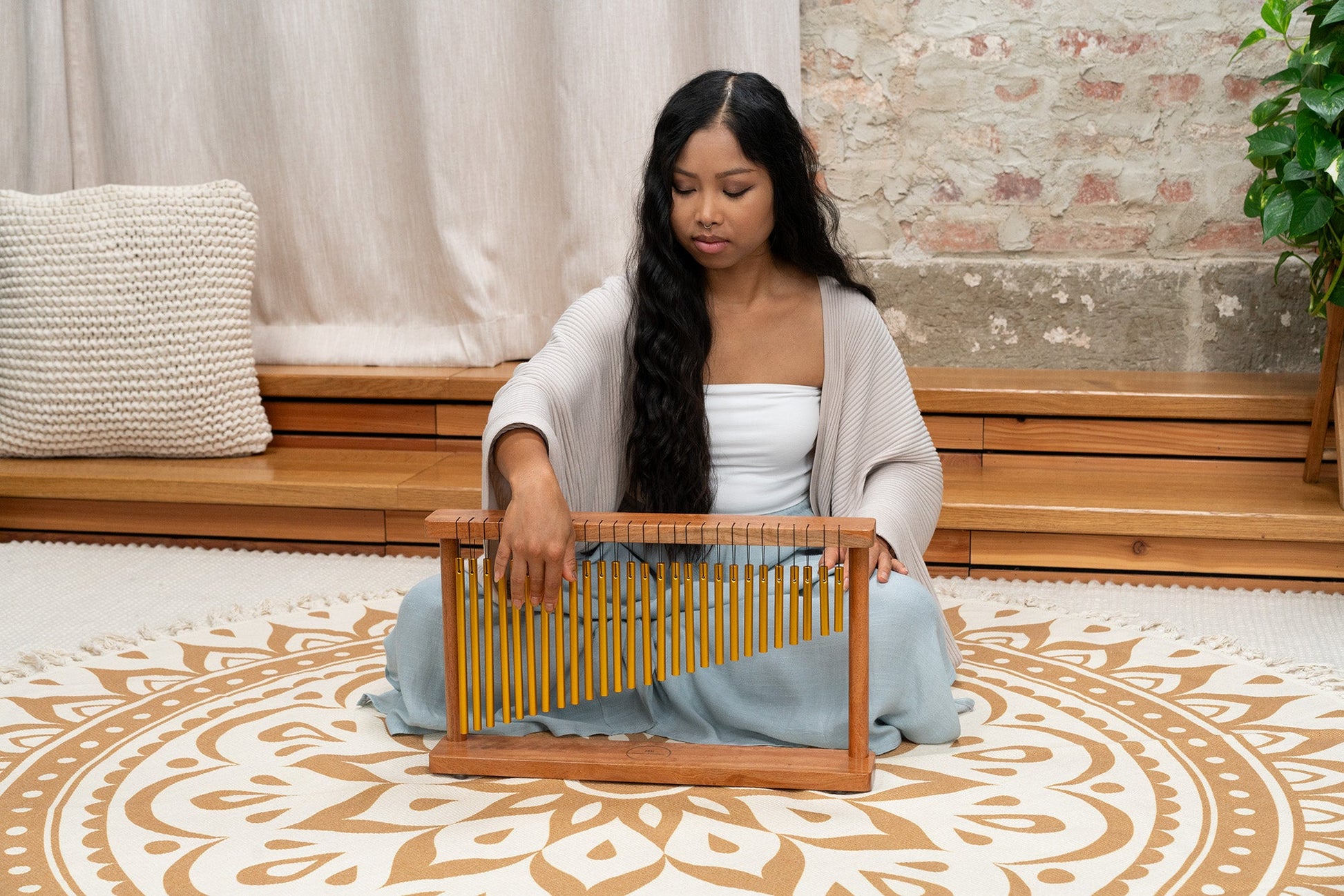 Transform any space into a sanctuary of tranquility with these versatile 27-bar table chimes, featuring beautiful Padauk wood and gold anodized aluminum bars for ethereal cascading tones that soothe mind, body, and spirit.