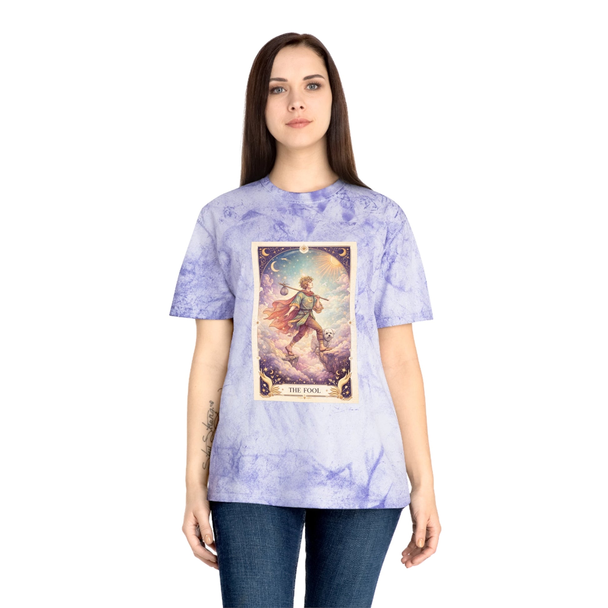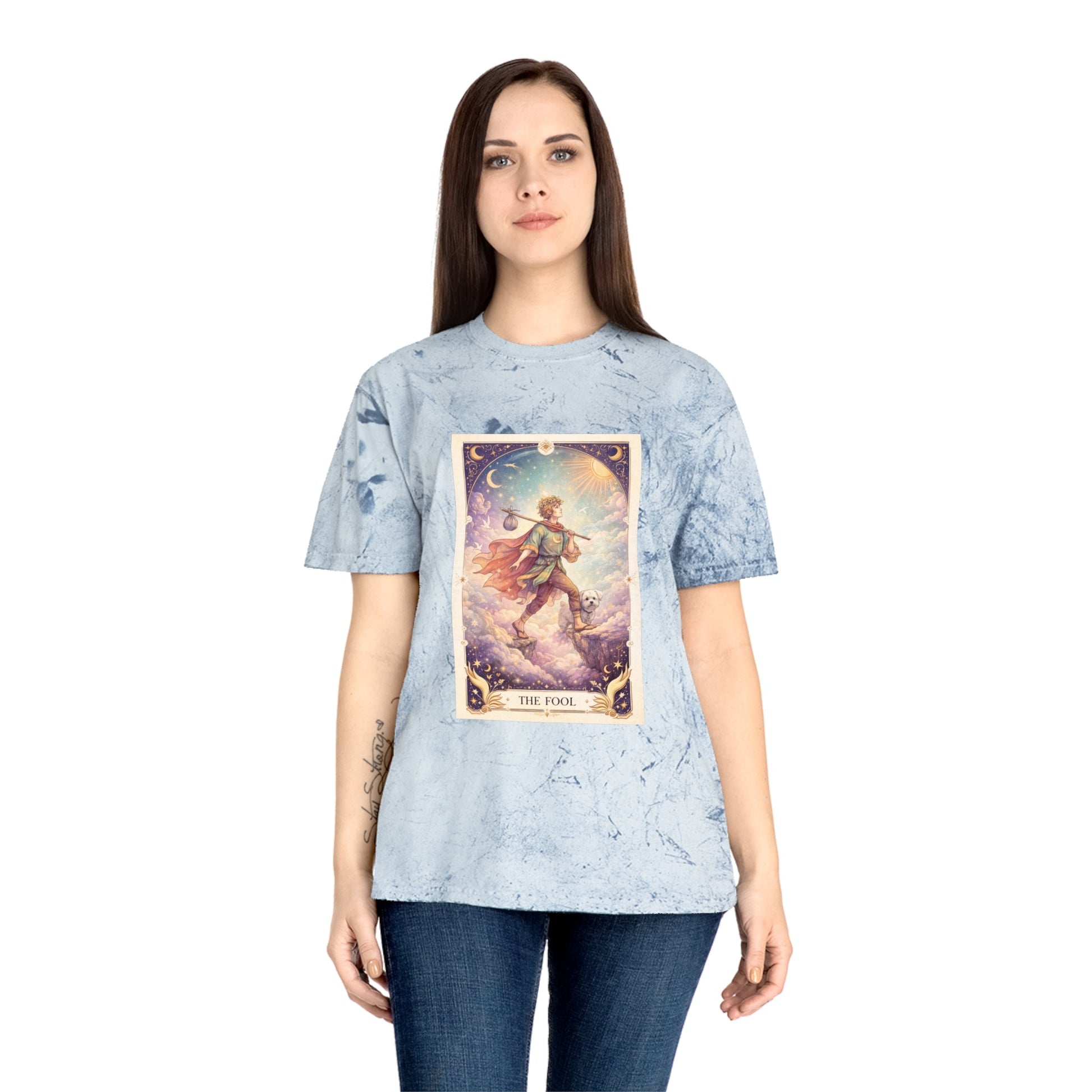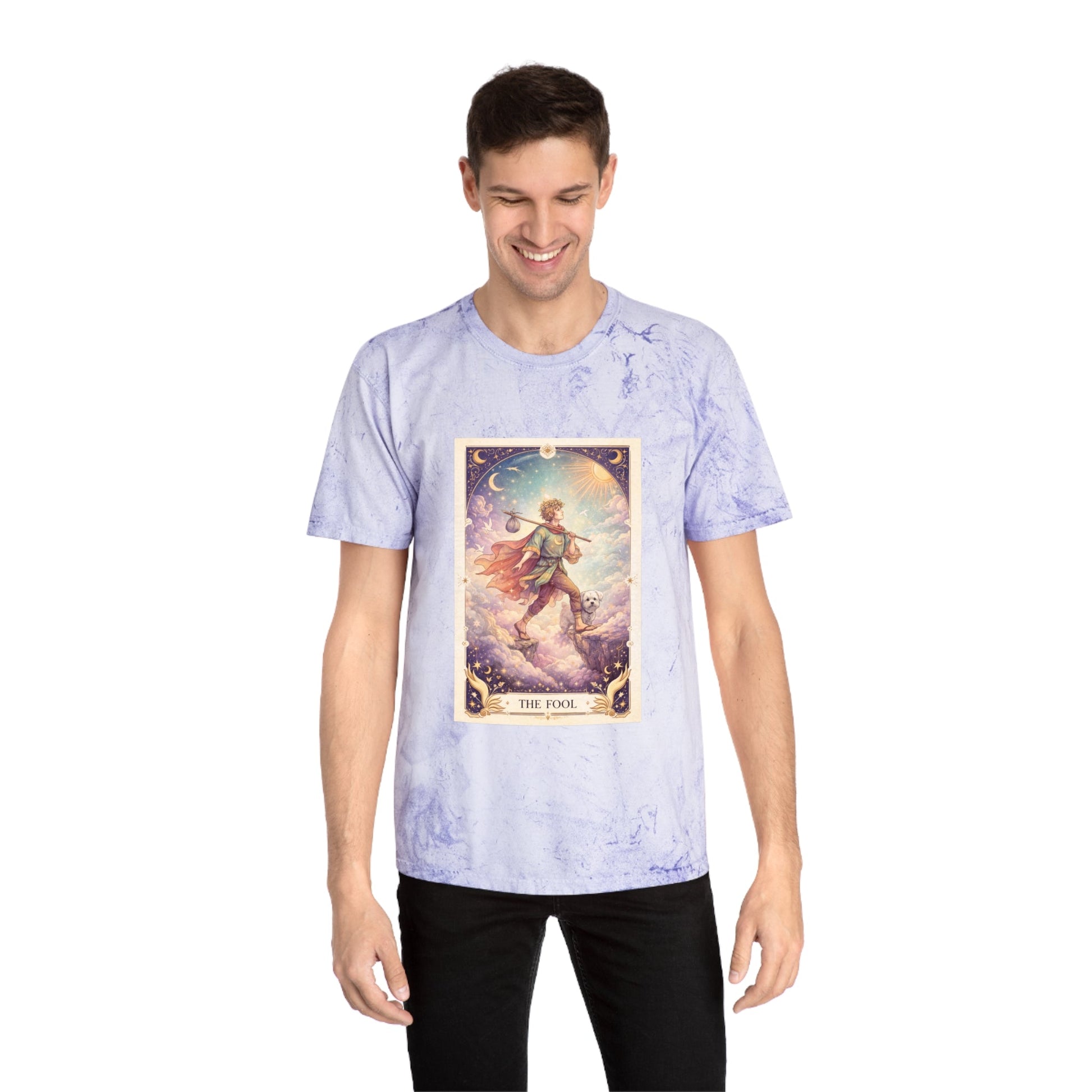 Printed on a Comfort Colors Color Blast tee, this shirt feels like a pocket of wonder you can wear. The garment-dyed, marbled fabric gives each piece a sun-washed, vintage character, making the tarot artwork feel timeless — as if it’s always belonged to you. No two shirts are exactly alike, mirroring the spirit of The Fool himself.