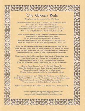 A traditional poem outlining the Wiccan Way in rhyme. Ends with the well-known 'an ye harm none, do what ye will.' 8 1/2" x 11"