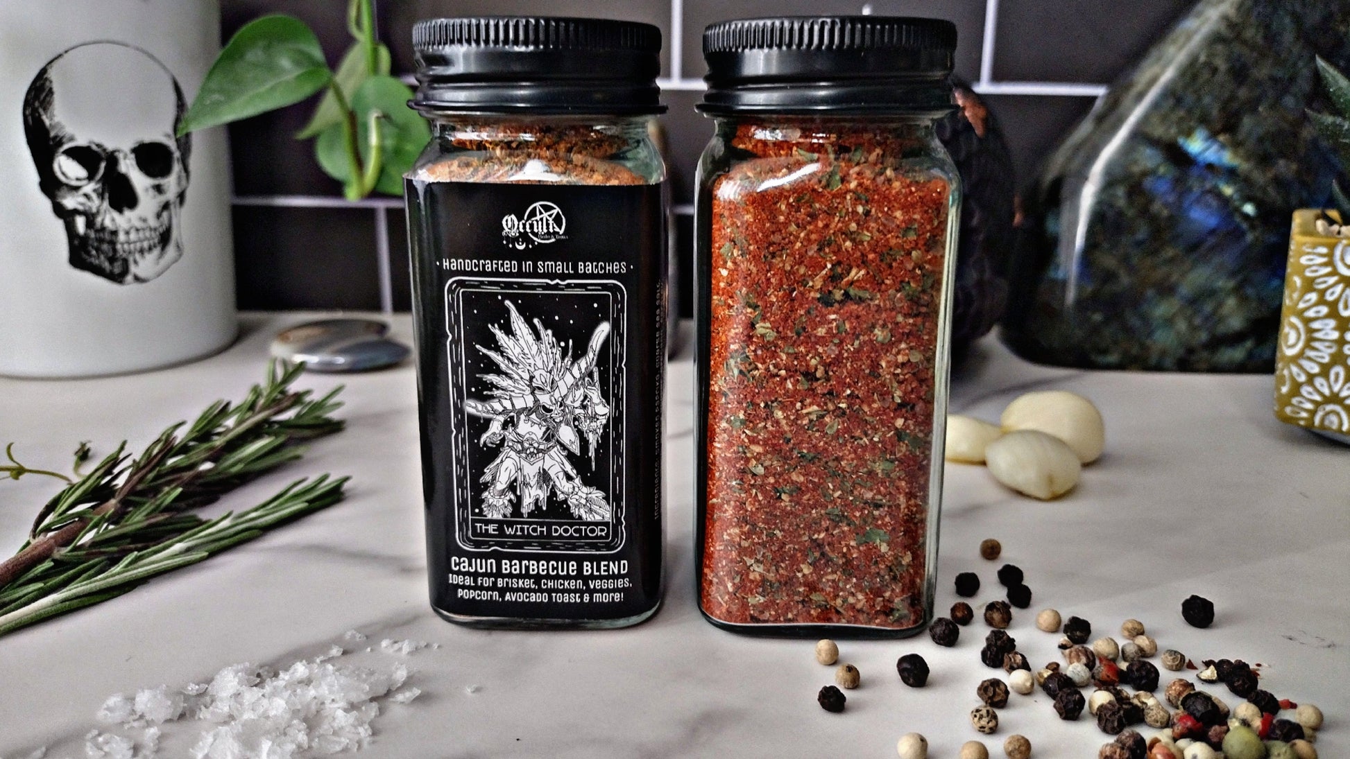 From the bayou’s shadowed heart comes the Witch Doctor—a smoky Cajun-inspired blend that calls upon the magic of southern spice. Cayenne heat, black pepper bite, and fresh bursts of parsley unite with a chorus of herbs to awaken meats, vegetables, and more. Ideal for brisket over open flame or chicken kissed by smoke, this blend turns every dish into a ritual feast. Handcrafted in small batches with quality-sourced ingredients, the Witch Doctor is your guide through the sacred fire of flavor.